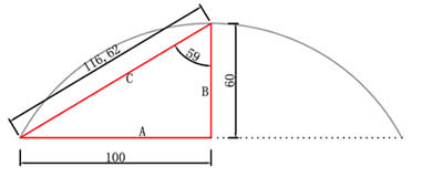 ③弦高弦長構成三角形 邊長即為 a=100 b=60 根據勾股定理計算c邊長 勾股定理公式:a平方+b平方=c平方 即:c=116.62